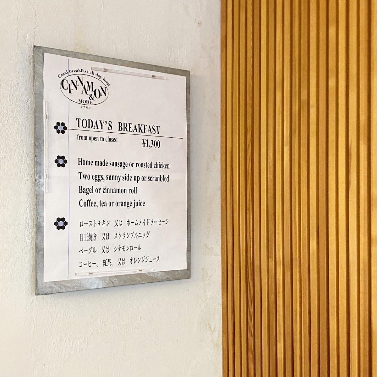 The menu may be succinct, but it shines with quality and flavor. Renowned for its cinnamon buns, each bite is a blissful burst of sweetness and spice—a testament to the owner's baking prowess. Accompanied by a choice of coffee or tea, the Cold Pork Sandwich served at breakfast is another standout, a hearty option that hits the spot and sets the tone for a perfect day ahead. Regulars appreciate how the menu evolves daily, so you can always find something new with each visit. At just JP¥1,200, this delightful breakfast set is not only delicious but also incredibly reasonable.